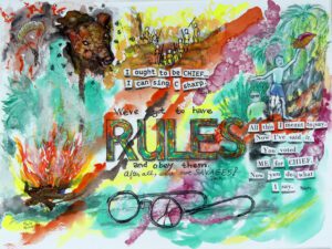 Soulard Art Gallery’s Politically Incorrect Correct show, from August 8 to September 12, 2025, features an artwork by Paula Homan. The mixed media piece is based on quotes and visual references to William Golding’s Lord of the Flies, addressing tribalism, the battle to be the strongest voice, and how power slips or flips with unexpected consequences. The position of chief is precariously held only as long as favorable circumstances allow. Mob mentality can undercut a chief’s rule with chaotic and deadly results.